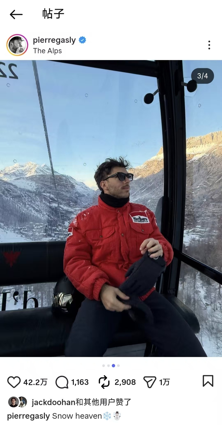 Alpine车手加斯利在几周之前曾于社交媒体平台发布了自己在圣诞假期于阿尔卑斯山滑雪的一些动态。