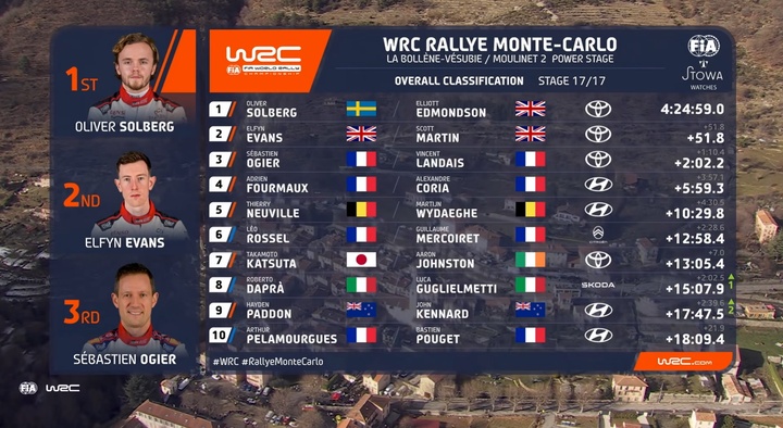 再度代表丰田阵营出战最高组别赛事的奥利弗·索伯格在第2赛段取得领跑后便没有再让出过领先的位置,他跟领航员埃德蒙森最终以51.8秒的优势战胜两位丰田阵营的队友,拿下了属于的自己首个蒙特卡洛拉力赛分站冠军。索伯格在代表丰田两度出战最高组别的赛事里也都双双拿下了分站冠军。