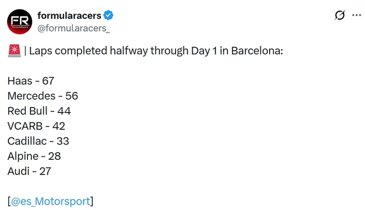 冬测首日实时圈数:哈斯67圈第一,梅奔红牛其次