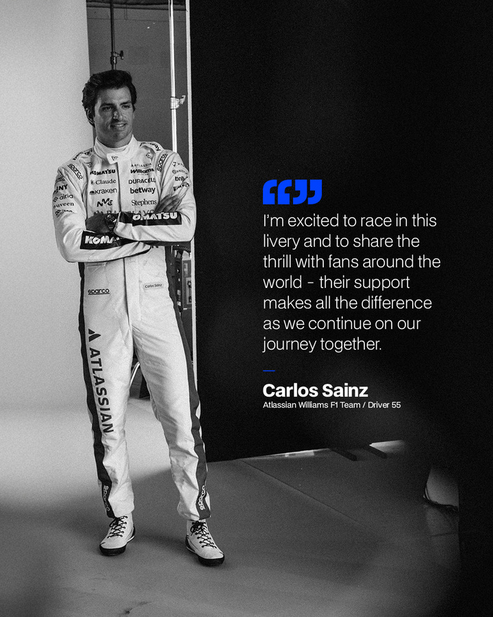 塞恩斯在威廉姆斯涂装发布会上表示:“我很兴奋能驾驶这款涂装参赛,并与世界各地的粉丝分享这份激情一一他们的支持对我们共同前行的道路至关重要。”
