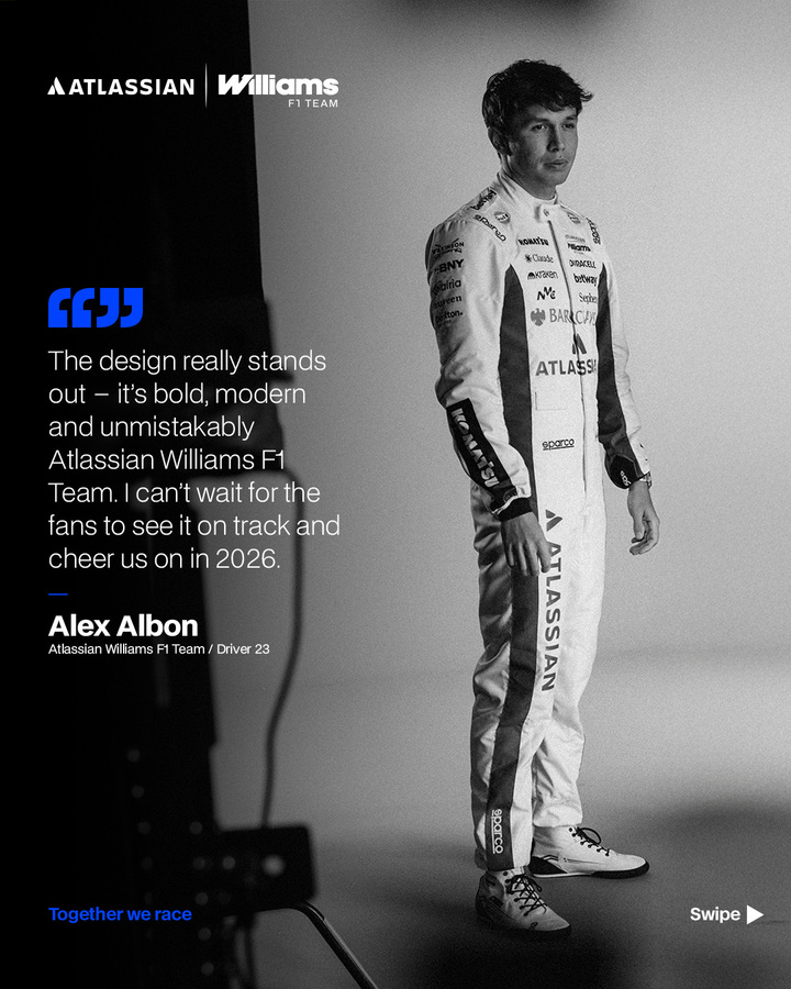 这款涂装的设计非常突出大胆、现代,而且毫无疑问拥有威廉姆斯的基因。我迫不及待地想和粉丝们一起在赛道看到它,并在2026年为我们加油助威。