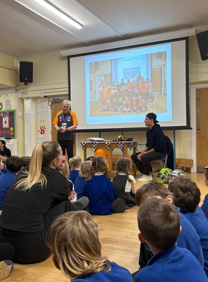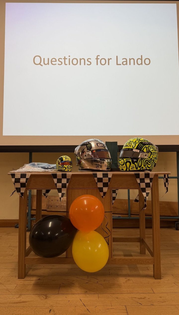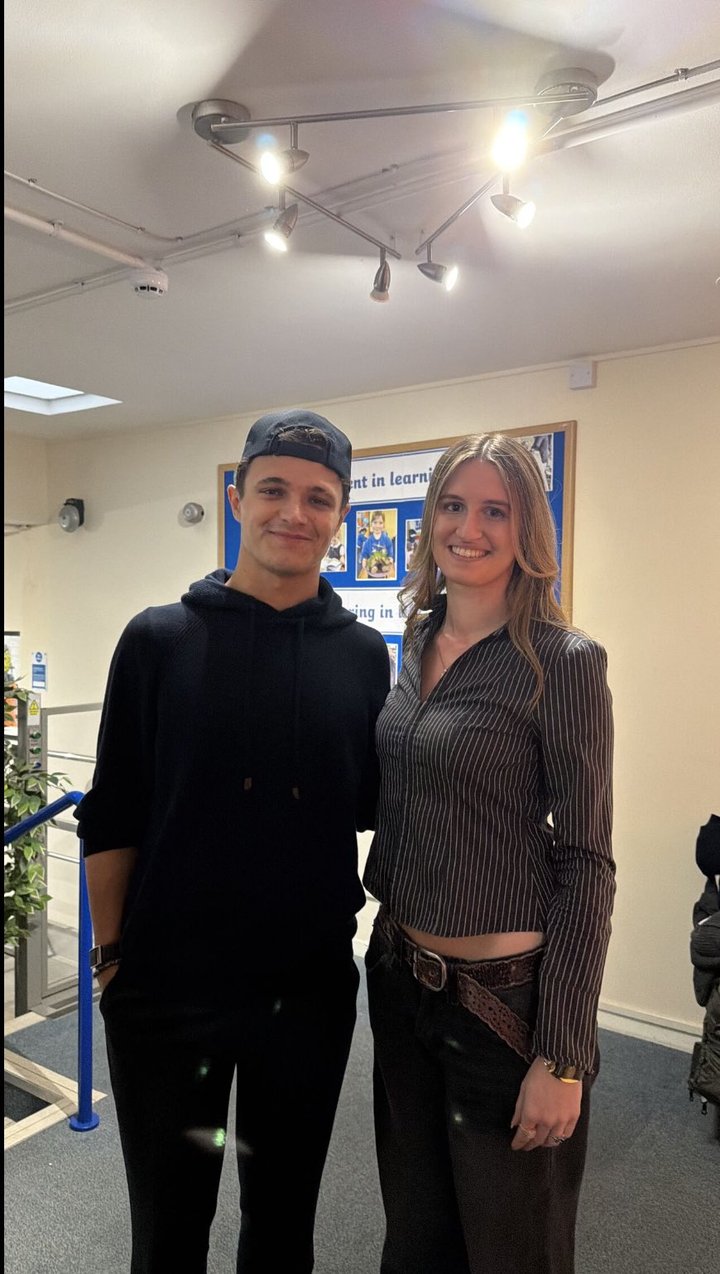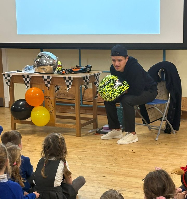 诺里斯周一回到母校丘斯托克教会学校,获得了学校颁发的荣誉校友证书。他与学生们合影留念,参加了全校活动,随后是简短的问答环节。两名学生表演了诗朗诵,向诺里斯赠送了礼物。
