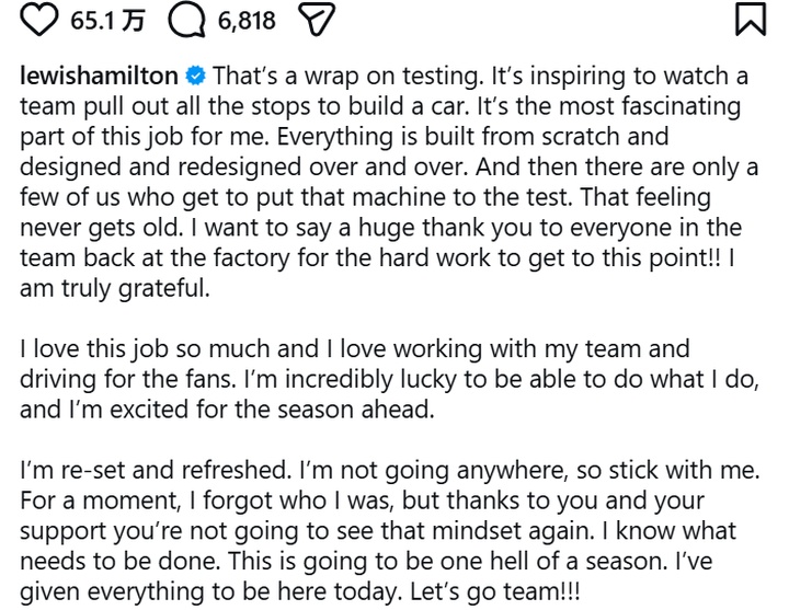 法拉利车手汉密尔顿在完成季前测试之后,于社交媒体平台上更新了自己的个人感想以及对新赛季到来的期待。