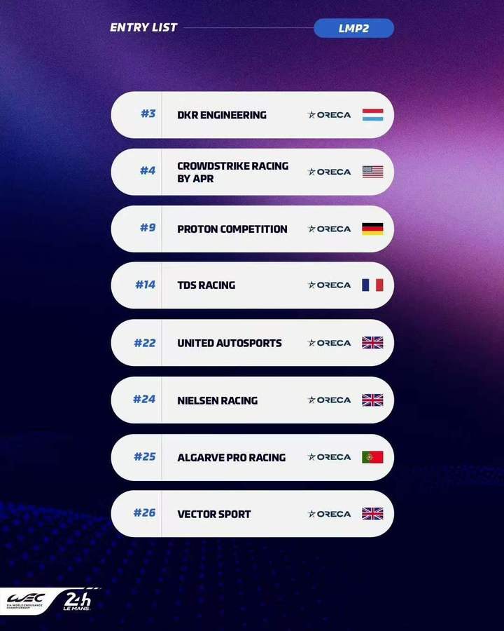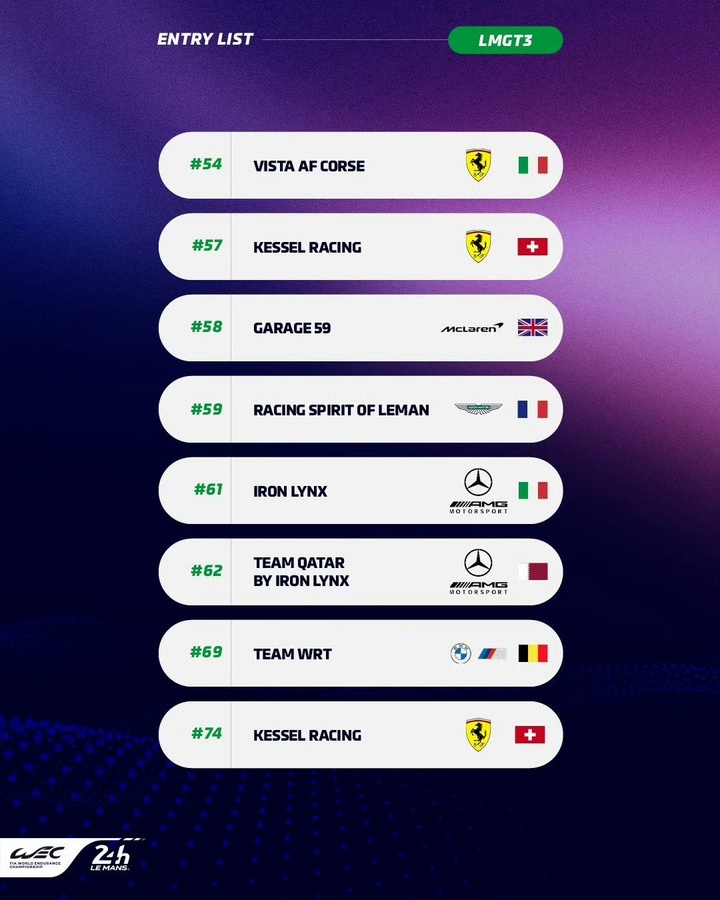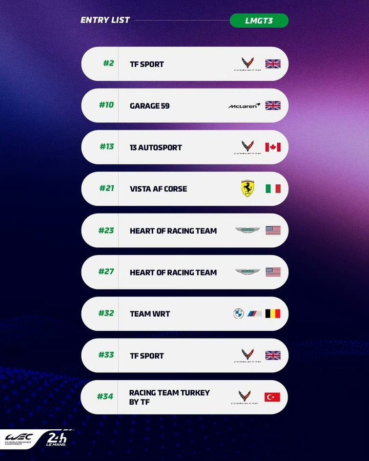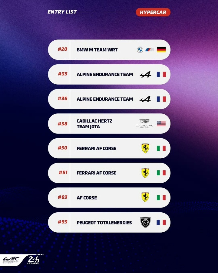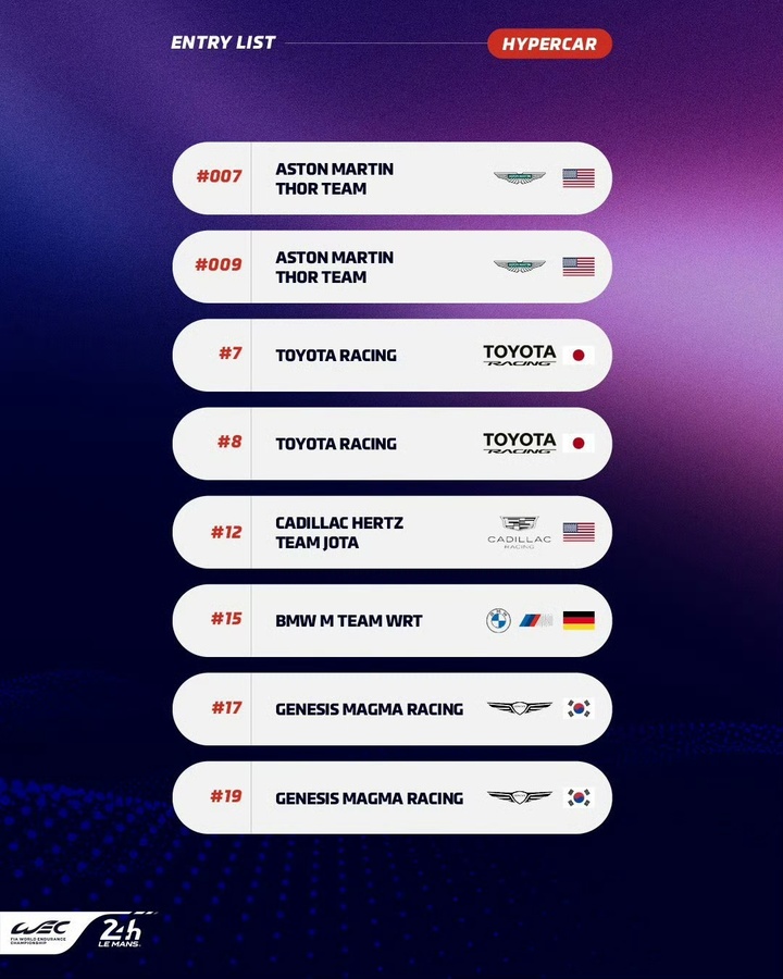 虽然18辆赛车是自2023年以来该组别参赛规模最小的一年,但仍有多达8家制造商将会同场竞技,他们分别是:阿斯顿马丁、丰田、凯迪拉克、宝马、Alpine、法拉利、标致以及今年的WEC新军捷尼赛思。