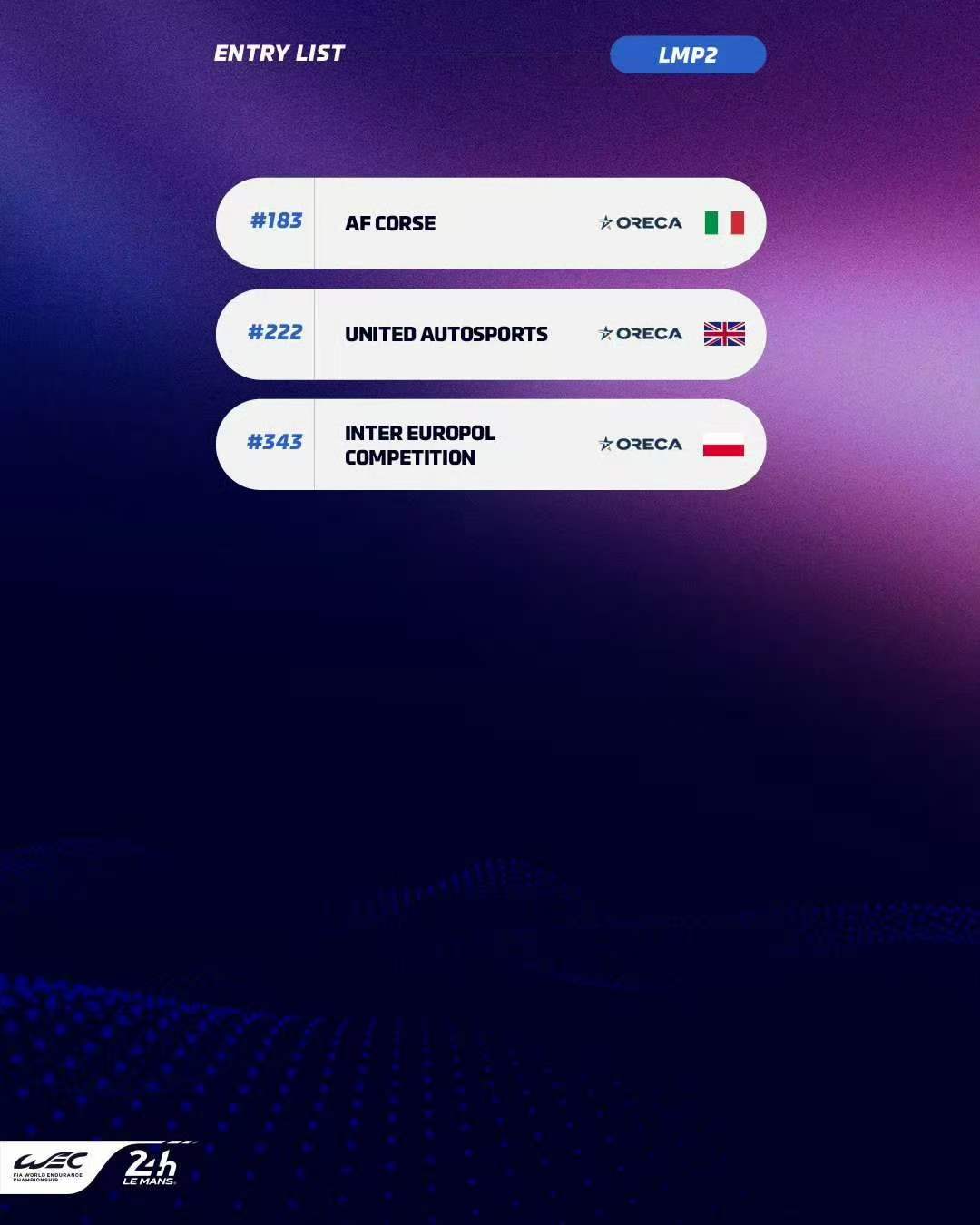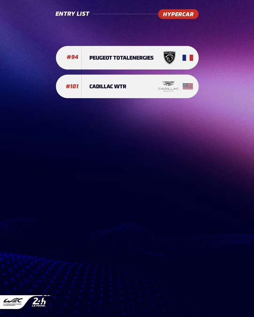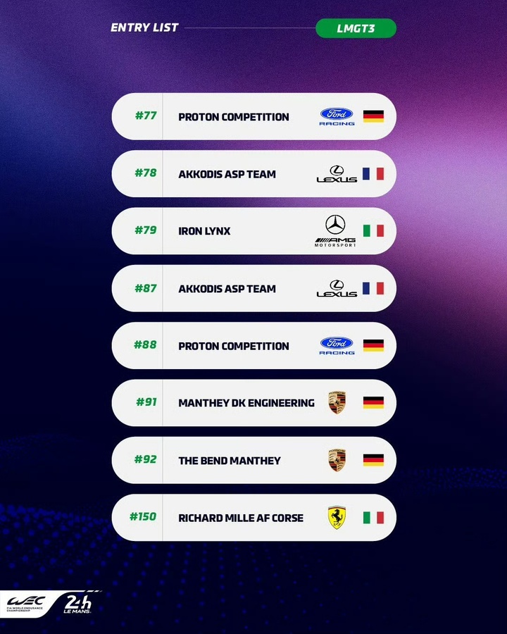 虽然18辆赛车是自2023年以来该组别参赛规模最小的一年,但仍有多达8家制造商将会同场竞技,他们分别是:阿斯顿马丁、丰田、凯迪拉克、宝马、Alpine、法拉利、标致以及今年的WEC新军捷尼赛思。