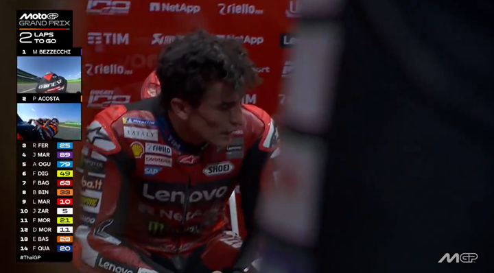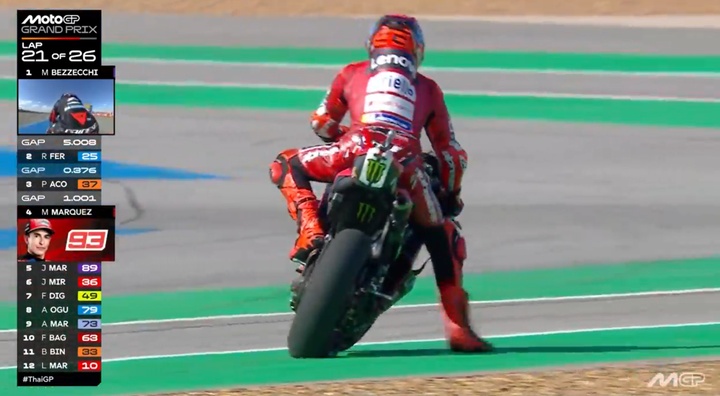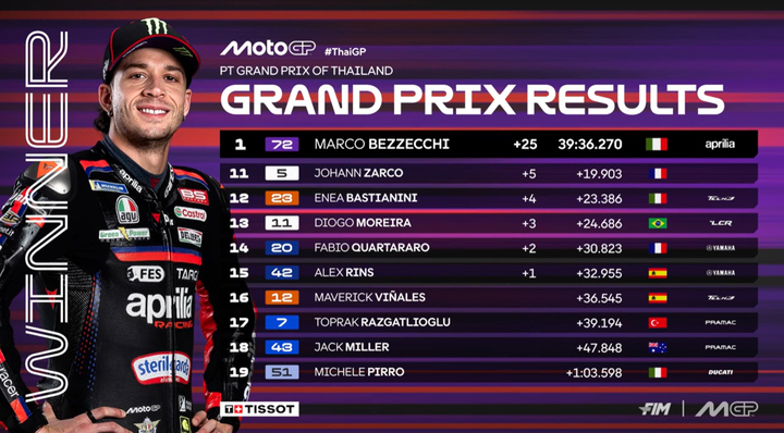 MotoGP泰国站正赛,杆位起步的贝塞奇在发车阶段守住领先位置之后就此一骑绝尘,他最终以超过5.5秒的优势率先冲线并拿到了本赛季的首个分站冠军。