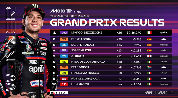 马丁、小椋蓝分获第4以及第5名,这意味着阿普利亚RS-GP26赛车包揽了前五名当中的四个位置!杜卡迪阵营完赛名次最好的车手是第6名的迪詹南托尼奥,杜卡迪连续88场大奖赛赛事至少有一位车手能登上领奖台的历史纪录也因此宣告终结。