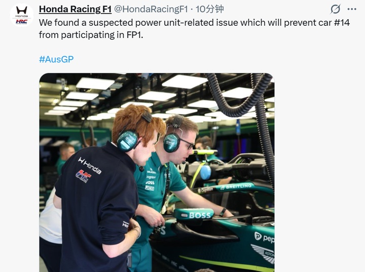 本田官方:阿隆索的引擎疑似出现故障,他将无法参与一练赛事