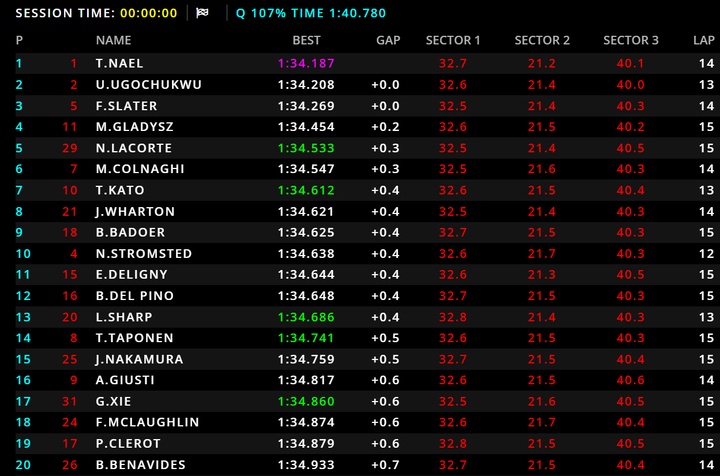 乌戈丘库、斯雷特、格拉迪斯、拉科尔特、科尔纳吉、加藤大翔、沃顿、布兰多·巴多尔、斯托姆斯泰德分别拿到第2至第10位。而取得第12位的德尔皮诺将在明天的冲刺赛里以倒序杆位的身份进行比赛的起步。