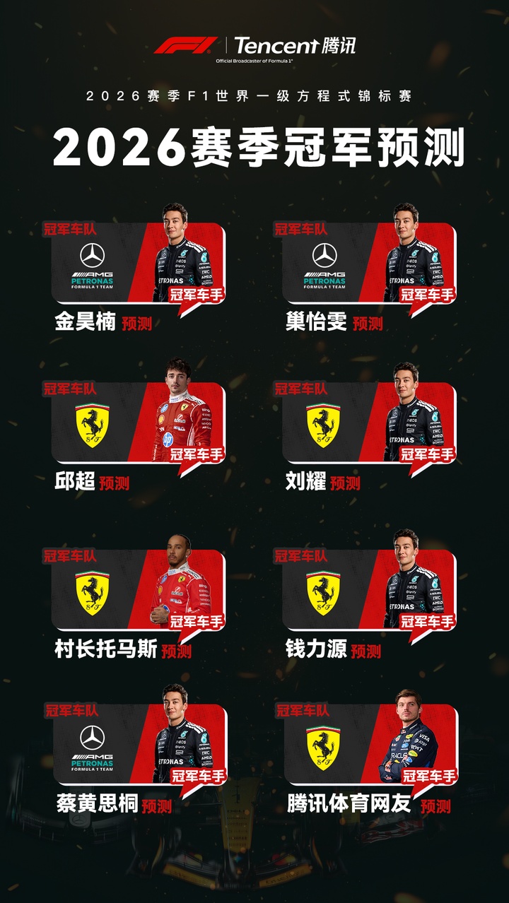 F1 2026赛季开战在即,腾讯体育各位F1解说老师也都给出了对于2026赛季总冠军的预测。