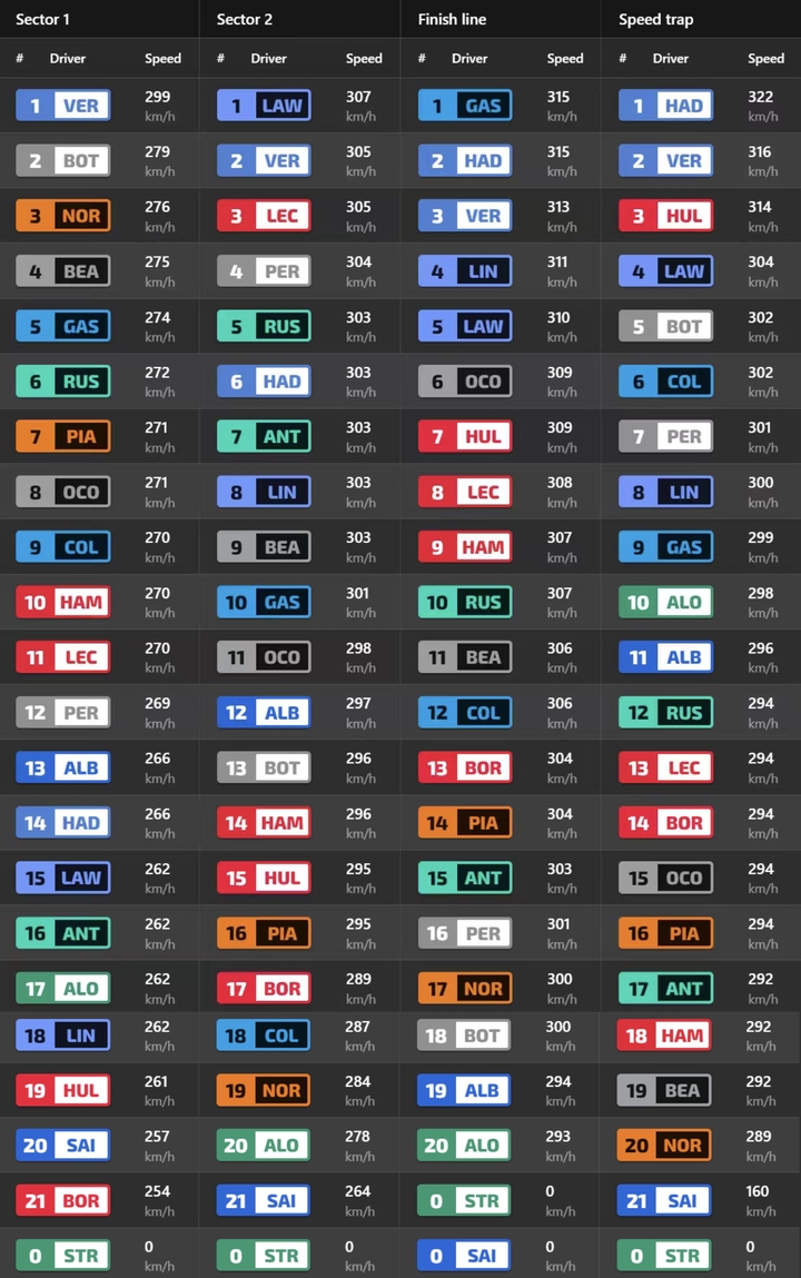 三练分段速度榜:维斯塔潘第一段最快,劳森第二段最快