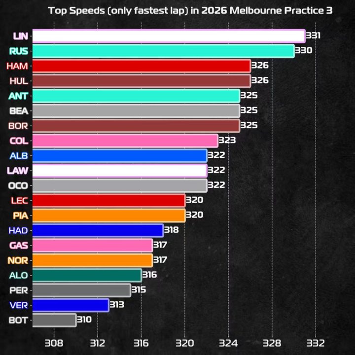 林德布拉德以331km/h排名三练最高时速榜首,拉塞尔和汉密尔顿分列二三。凯迪拉克两位车手与维斯塔潘排在最后三位。测速点的时候有很多车手已经super clipping,时速可能会略低。