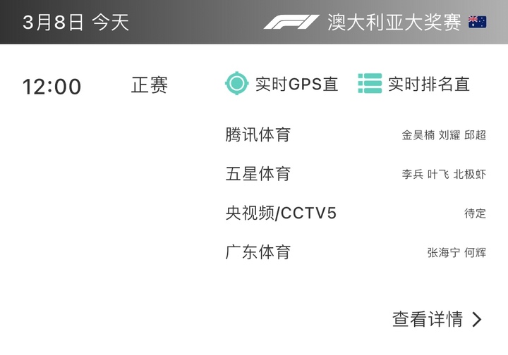 每日赛车App将在今天12点,图文+数据直播F1澳大利亚站正赛。您只需将App升级到最新版本,在直播期间从“比赛”标签里点击“查看详情”,即可观看“实时排名直播”和“实时GPS直播”。