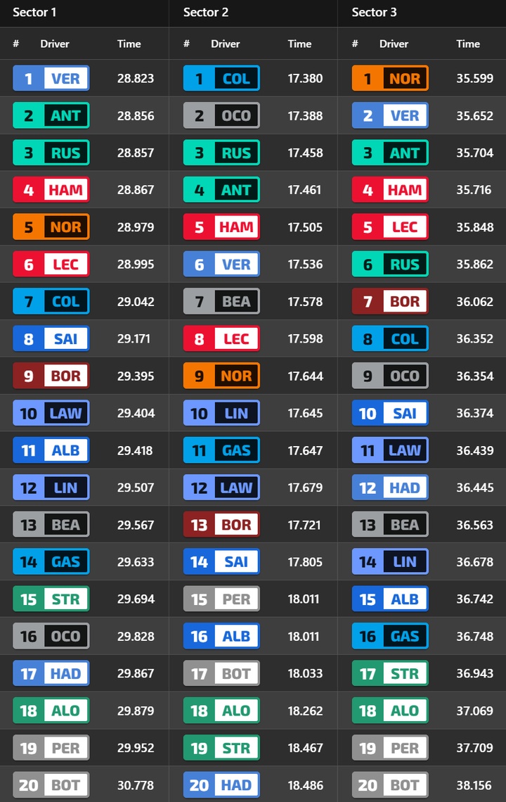 正赛分段计时榜:维斯塔潘S1最快,科拉平托S2最快