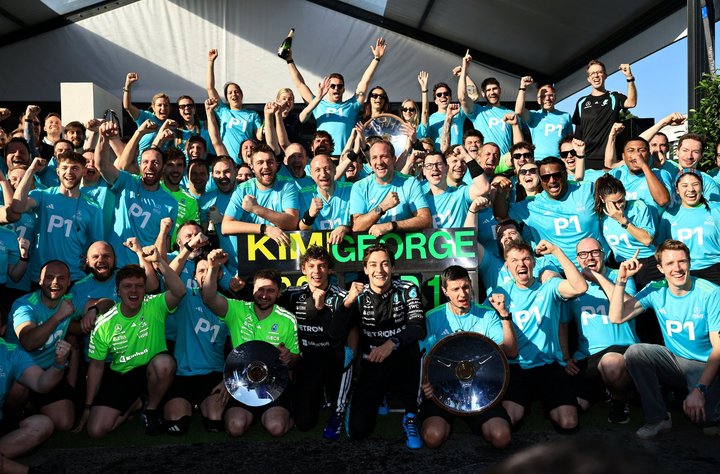 梅赛德斯赛后激情庆祝,安东内利享受香槟雨