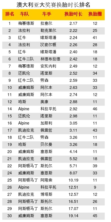 澳大利亚站换胎时长:拉塞尔最快用时2.17s,勒克莱尔第2