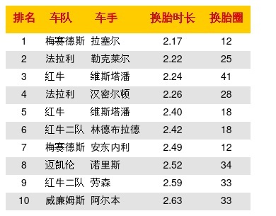 澳大利亚大奖赛换胎时长排名:梅赛德斯车队的拉塞尔第1名用时2.17秒;第2名是勒克莱尔用时2.22秒;第3名是维斯塔潘。前10名榜单见下图: