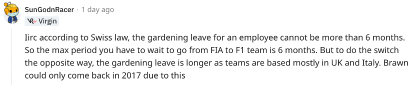 有人认为他的间隔期会非常短。这是由于FIA的注册地在瑞士,根据瑞士法律,竞业期不能超过6个月。但各家车队的注册地普遍在英国和意大利,这两个国家的竞业期普遍较长,所以FIA员工转车队的竞业期一般短于车队员工转FIA。