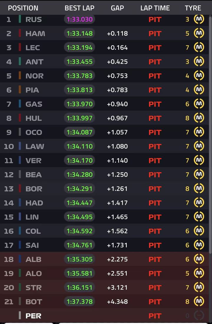 拉塞尔前两段刷紫1:32.241轻松上到P1,安东内利+0.329s P2,从P4开始的皮亚斯特里都在1:33+,维斯塔潘1:33.564在P7