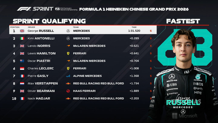 中国大奖赛冲刺排位赛结束,拉塞尔轻松拿下杆位,领先0.6s+,安东内利P2,诺里斯P3,汉密尔顿P4,皮亚斯特里P5,勒克莱尔P6,加斯利P7,维斯塔潘P8