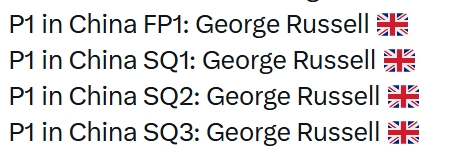 在本周的中国大奖赛中,拉塞尔在一练,冲刺排位赛(SQ1、SQ2和SQ3)均取得第一。