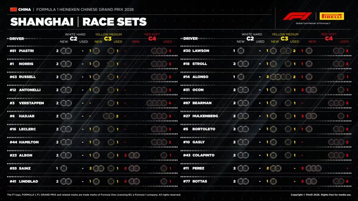 只有维斯塔潘和博塔斯剩余1套中性胎,他们也是唯二剩余4套软胎的车手。绝大多数车手都剩余2套硬胎、2套中性胎以及3套软胎。