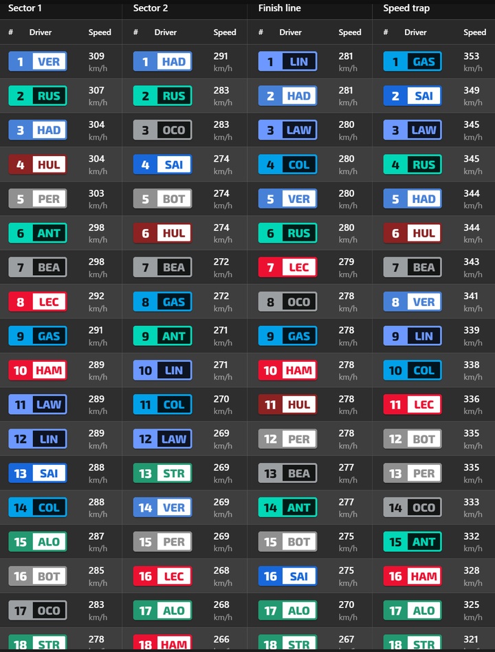 中国大奖赛正赛测速点榜单,Alpine车队的加斯利353km/h最快,威廉姆斯的塞恩斯349km/h第二,前两名均被梅赛德斯动力单元阵营包揽。