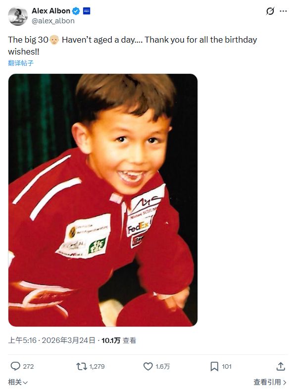 威廉姆斯车手阿尔本在社交媒体平台写道:30岁啦!我感觉自己一点都没变老……谢谢大家的生日祝福!!