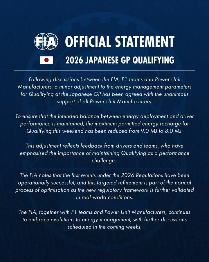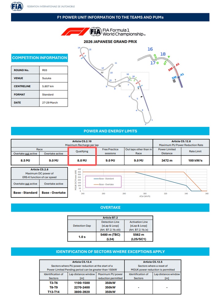 FIA在每站都会公布的动力单元信息数据里对于日本站排位赛里赛车的最大单圈充电量做出了修改。