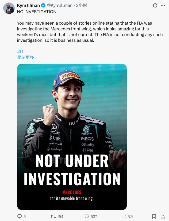 F1赛事官方摄影师Kym Illman发文表示,此前有新闻媒体称FIA正在调查梅赛德斯前翼的说法并不属实。