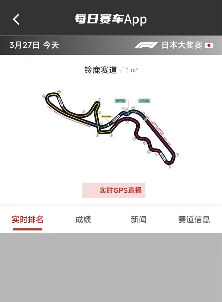 每日赛车App将在今天下午13:00图文+数据直播F1日本站正赛的赛事。您只需将App升级到最新版本,在直播期间从“比赛”标签里点击“查看详情”,即可观看“实时排名直播”和“实时GPS直播”。