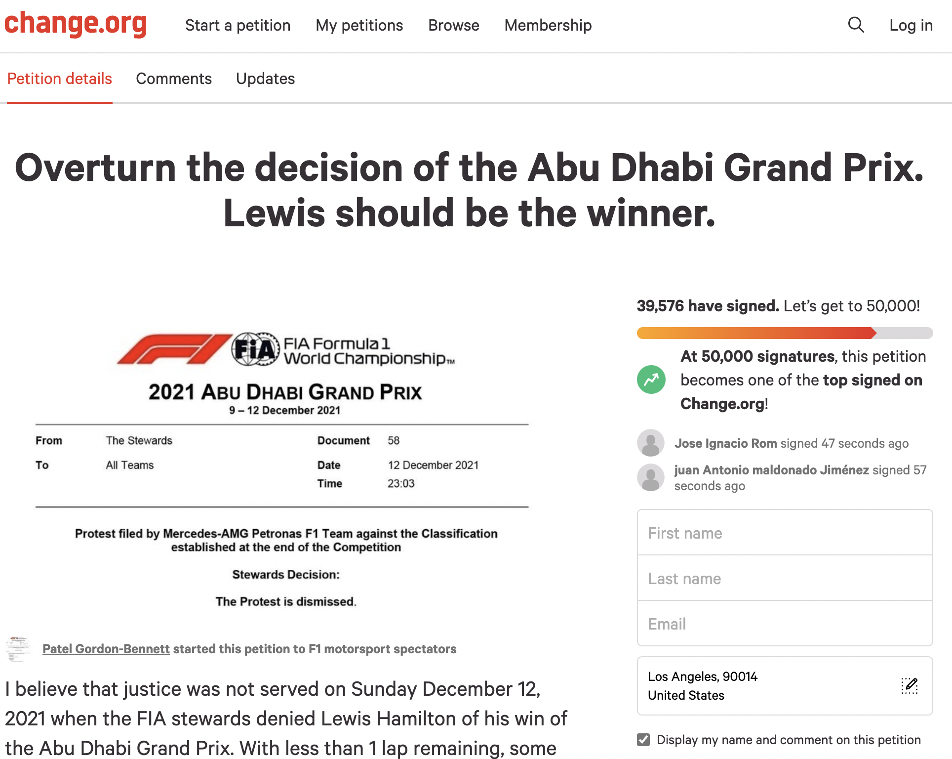 收官站结束后两天,我们曾报道过,外网有车迷发起了为汉密尔顿正名的请愿活动,呼吁FIA工作人员将世界冠军归还给汉密尔顿。