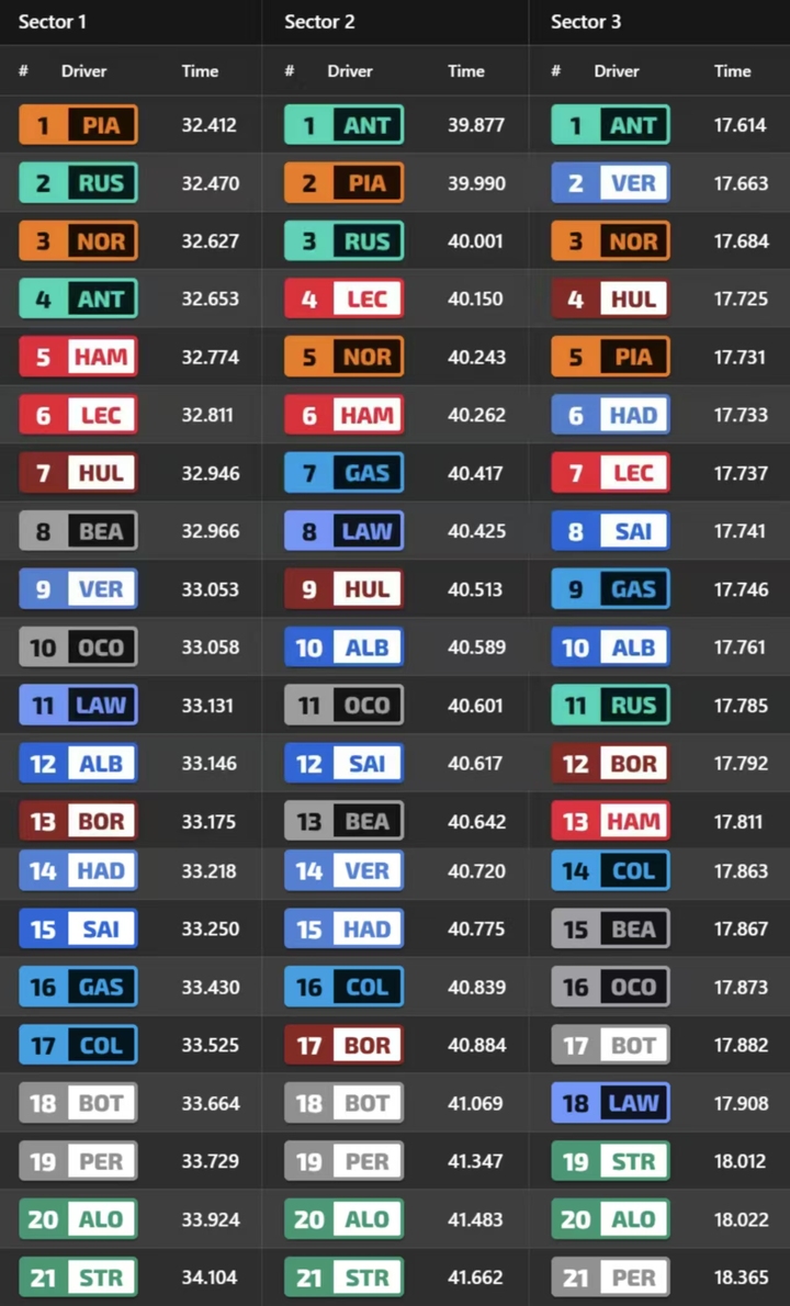安东内利则包揽了第二和第三计时段的最快。维斯塔潘虽然在第三计时段排在第二位,但他其实在这个最短的分段内没有获得明显的优势。