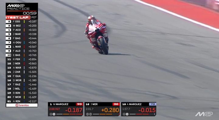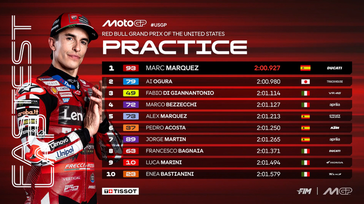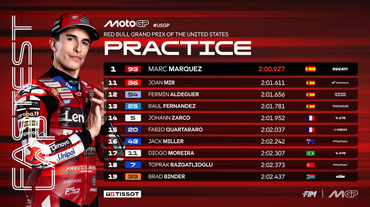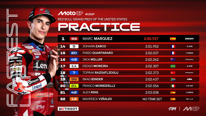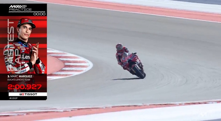 美国站周五的赛事北京时间今天凌晨顺利进行。马克·马奎兹克服一练高速摔车事故的影响之后,在决定10个直通Q2的练习赛里做出2分00秒927的单圈成绩拿下了本节练习赛的头名。