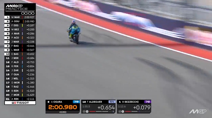 Trackhouse车队的小椋蓝是另一位跑进2分01秒大关的车手,他紧随在马奎兹身后拼下第2名的优异成绩。迪詹南托尼奥、贝塞奇、亚历克斯·马奎兹、阿科斯塔、马丁、巴尼亚亚、马里尼以及巴斯蒂亚尼尼取得3到10位。上述10位车手获得了排位赛直通Q2的资格。