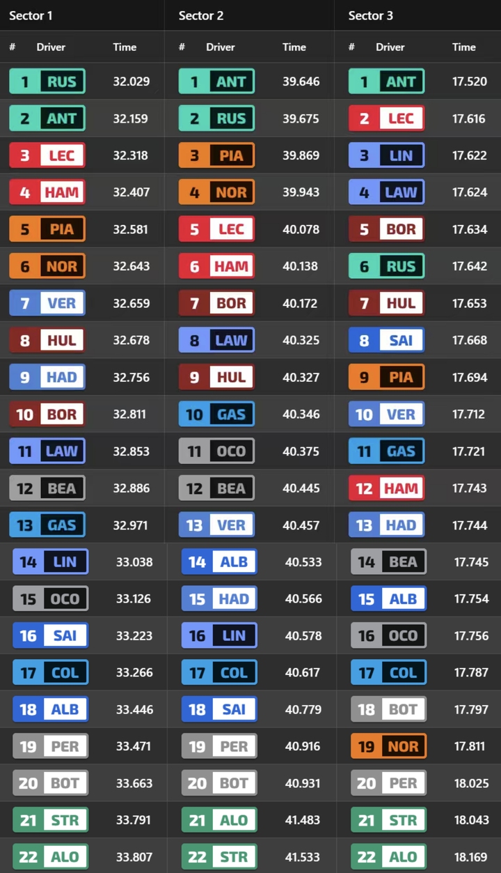 三练分段计时榜:拉塞尔第一段最快,安东内利二三段最快