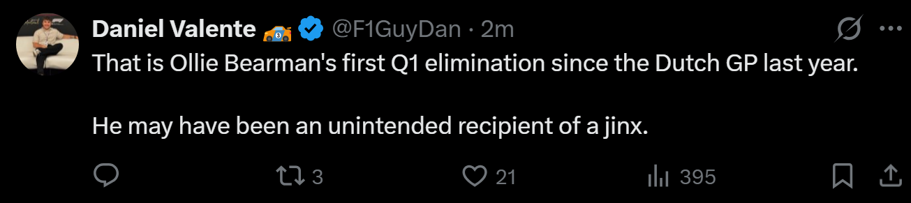 2025年荷兰大奖赛之后,贝尔曼首次排位赛Q1出局