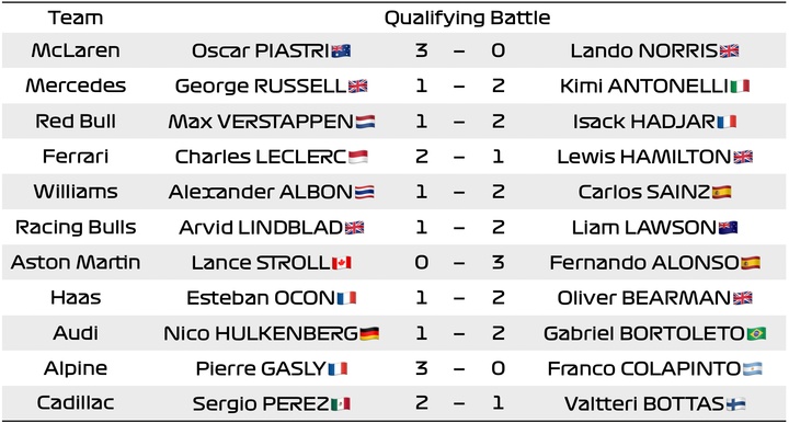 排位赛队友PK:皮亚斯特里3-0,维斯塔潘1-2
