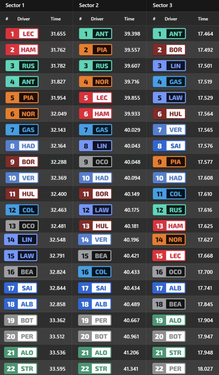 排位赛分段计时榜:勒克莱尔第一段最快,安东内利二三段最快