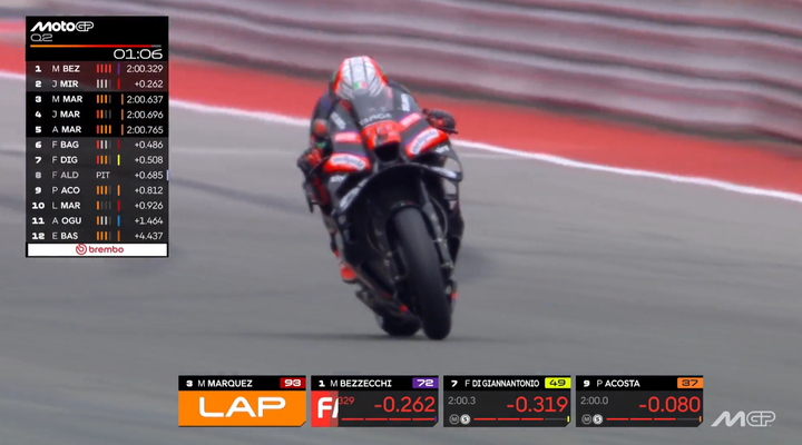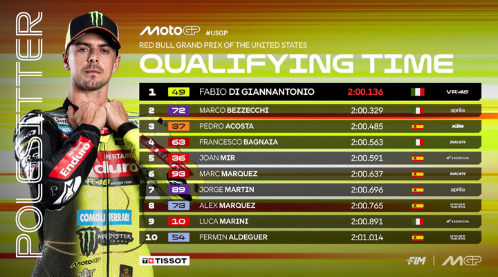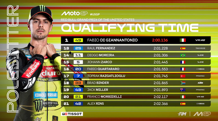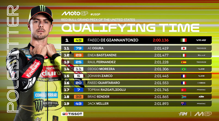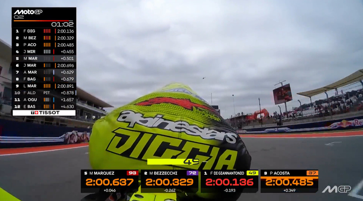 美国站排位赛的赛事刚刚结束,来自VR46车队的车手迪詹南托尼奥刷出2分00秒136的成绩继巴西站后再度拿下杆位。这也是他MotoGP生涯首次实现两连杆的成就。此外,这一单圈成绩足足比原赛道纪录快了0.7秒。