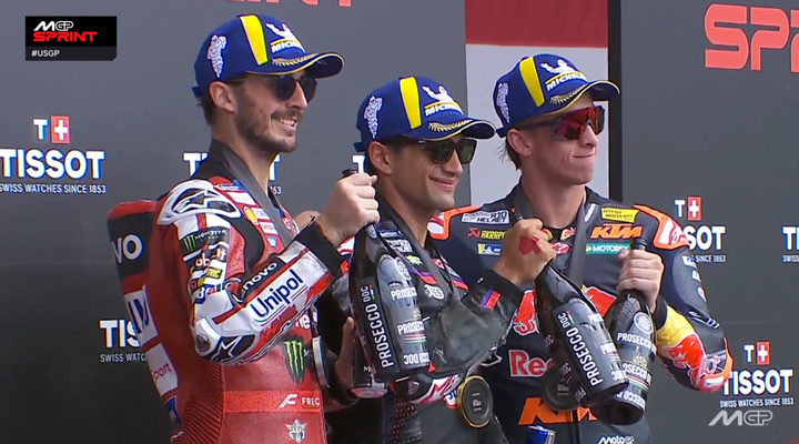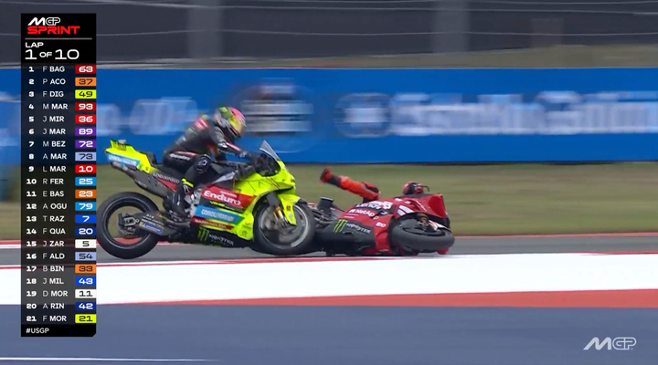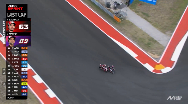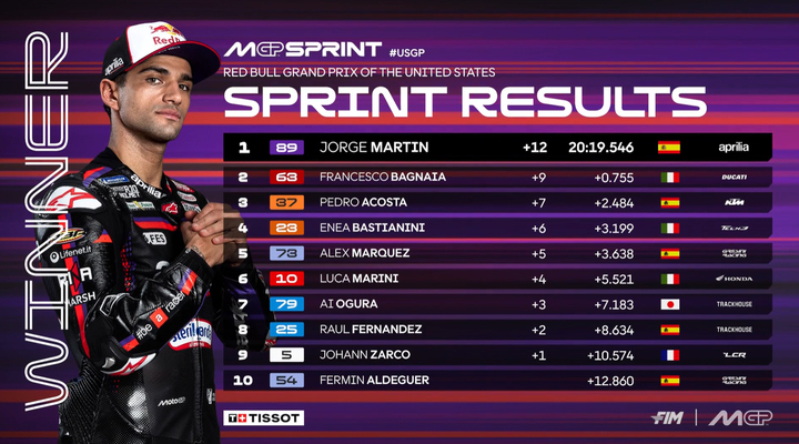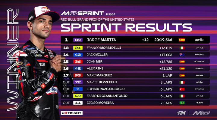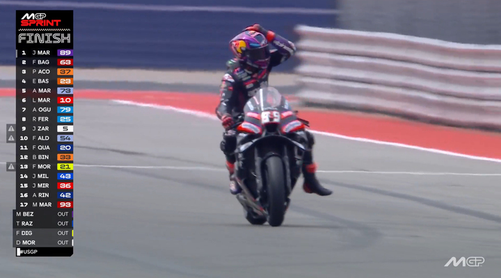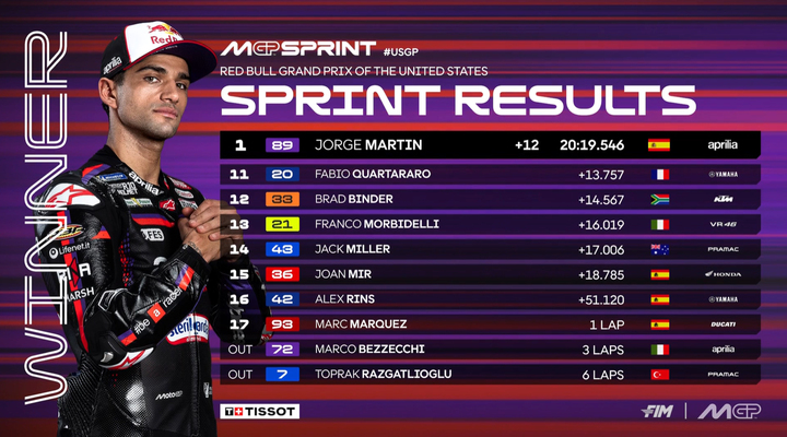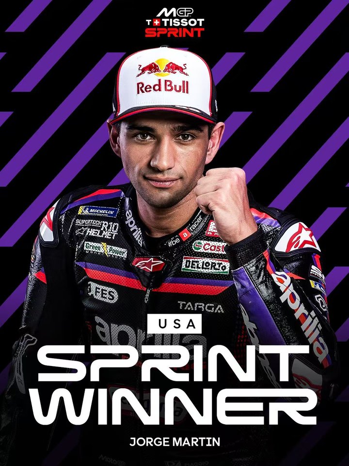 北京时间3月29日凌晨,MotoGP组别美国站冲刺赛在美洲赛道进行。在这场意外事故不断的比赛里,阿普利亚厂队的马丁利用后轮中性胎的优势在最后一圈的12号弯绝杀了使用后轮软胎的巴尼亚亚,最终马丁率先冲线拿到了自己自2024年马来西亚站以来的首个冲刺赛胜利,同时他还继2024年收官站后再度登顶车手积分榜!