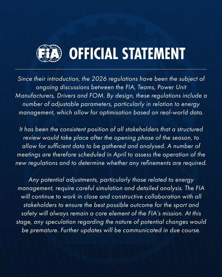 “在涉及贝尔曼于日本大奖赛的事故以及高接近速度是导致事故的原因之后,FIA希望以下做出澄清。自推出以来,2026年规则一直是各方持续讨论的主题。”