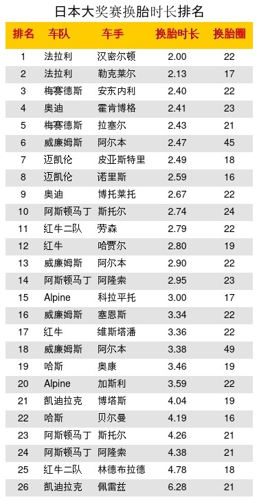 日本大奖赛换胎时长:汉密尔顿最快用时2.00s,勒克莱尔第2