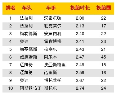 日本大奖赛换胎时长排名:法拉利车队的汉密尔顿第1名用时2.00s;第2名是勒克莱尔用时2.13s;第3名是安东内利。前10名榜单见下图: