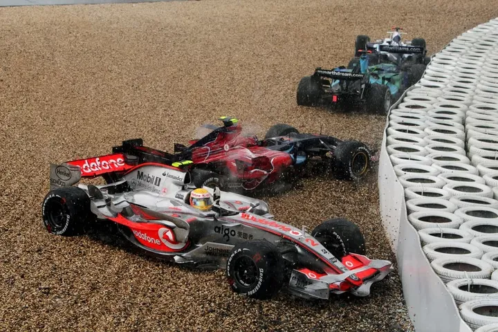 “我说‘什么意思?’当时那里已经有8辆车陷进去了,包括汉密尔顿、简森·巴顿。我说‘就是和其他人一样,我们在弯中打滑失控了。’他说‘不,不是所有人,只有那些混蛋。’”