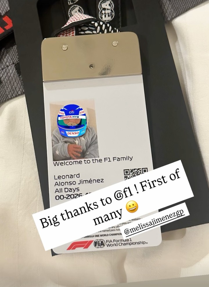 在社交媒体上,阿隆索晒出了F1送给他孩子的出生礼物,这是一张带有照片和宝宝名字的围场通行证,孩子的名字叫莱昂纳德·阿隆索·希门尼斯(Leonard Alonso Jiménez)