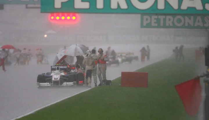 暴雨倾泻而下,能见度迅速归零,雪邦国际赛车场很快变成一片积水横流的险地。这场原定跑满56圈的比赛,只进行到第33圈便被红旗叫停,也因此成为F1历史上最著名的因极端天气中止的比赛之一。