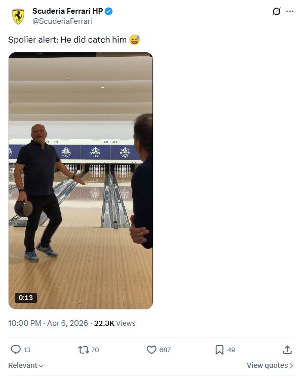法拉利车队继续在社交媒体平台发布了瓦塞尔和汉密尔顿打保龄球的片段。