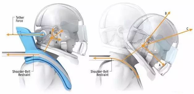 FIA在2003年规定所有赛车手必须佩戴的HANS系统,主要功能是抑制头部向前甩,防止车手的脊椎向后拉伤,把冲击力从颈椎分散至胸部、躯干、肩膀。
