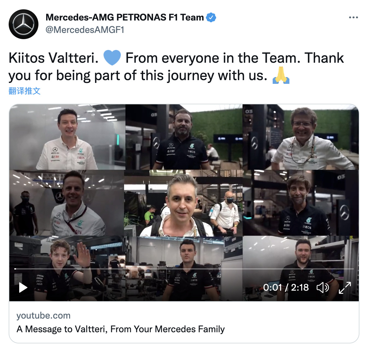 刚刚,梅赛德斯发布了视频,视频中,梅赛德斯许多员工用"Kiitos, Valtteri(再见,瓦尔特利)"的芬兰语向博塔斯告别。